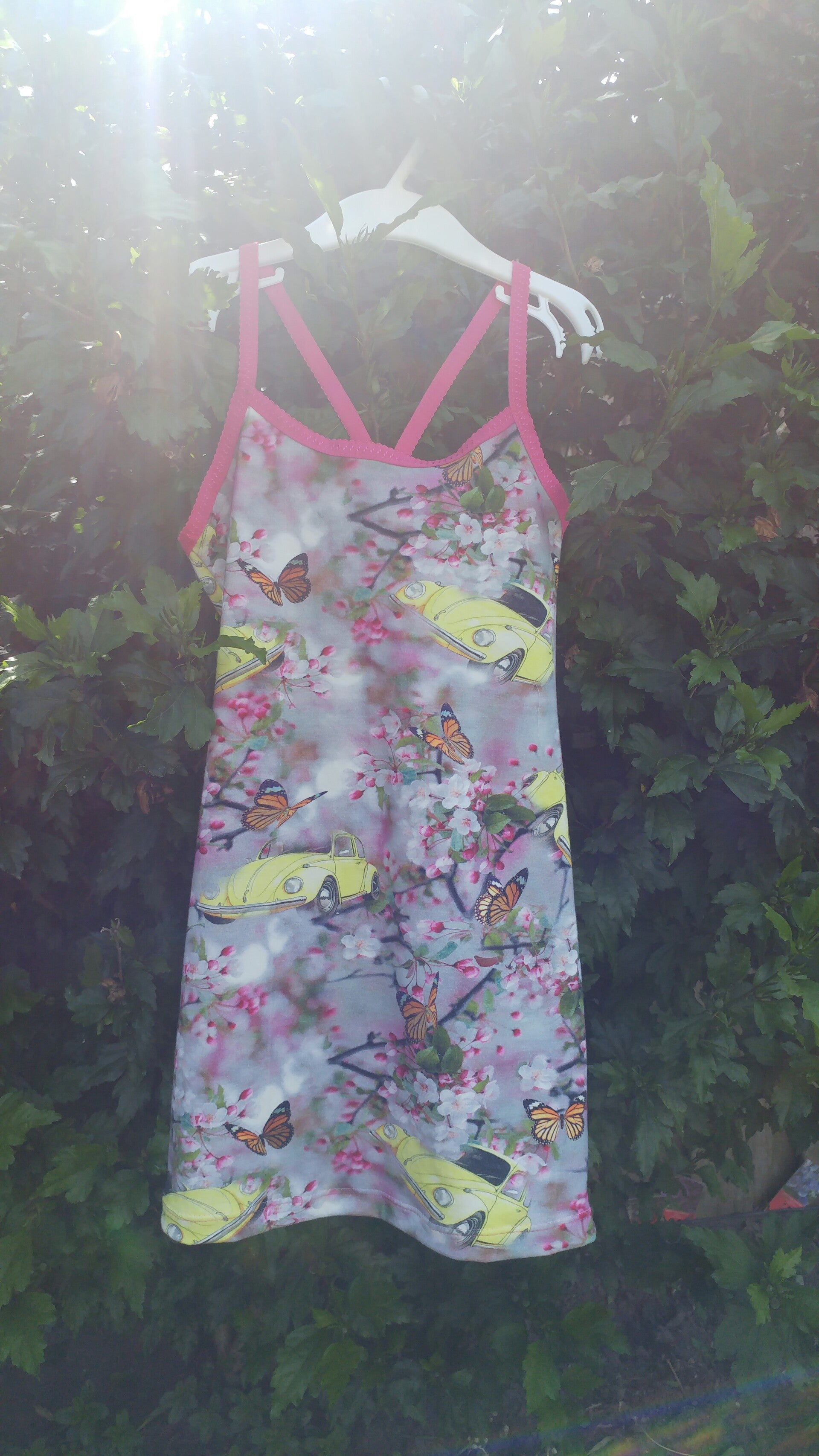 Leuk jurkje met spagetti-bandjes. Gemaakt in het stofje dat u wenst.